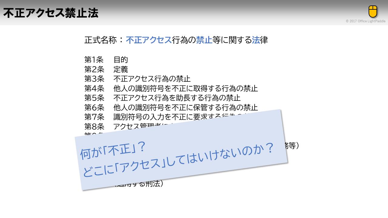 ITパスポート試験によく出る用語「不正アクセス禁止法」について解説しています。